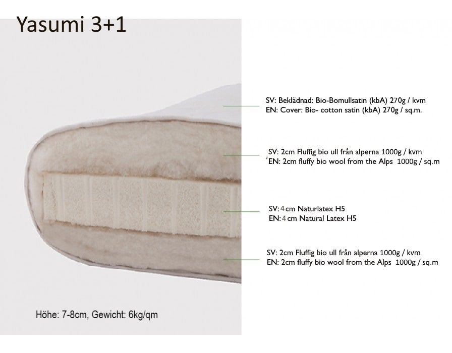 - Yasumi 3+1 3 med en 4cm latexkärna med fluffig ekologisk bomull på varje sida.