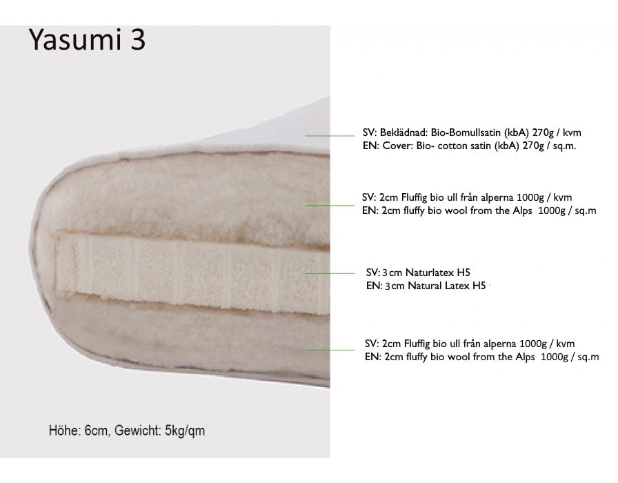 - Yasumi 3 med en 3cm latexkärna med fluffig ekologisk bomull på varje sida.