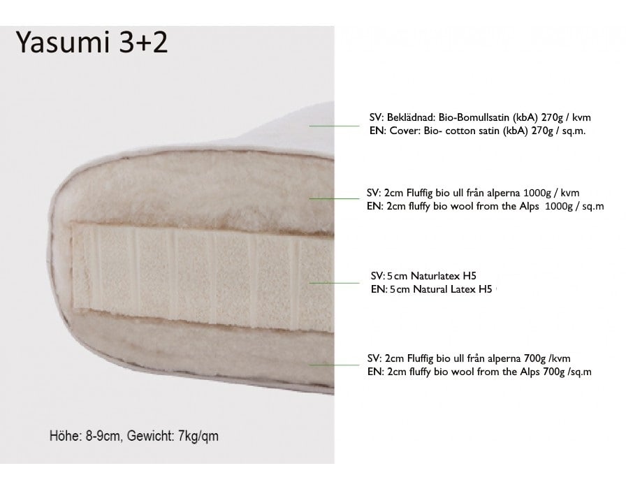 - Yasumi 3+2 3 med en 5cm latexkärna med fluffig ekologisk bomull på varje sida.