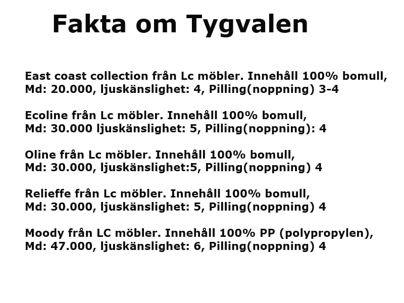 LC möblers bäddsoffor innehåller inga flamskyddsmedel varken i stoppning eller på tygerna. Läs mer om brandskydd under tygfakta på första sidan.