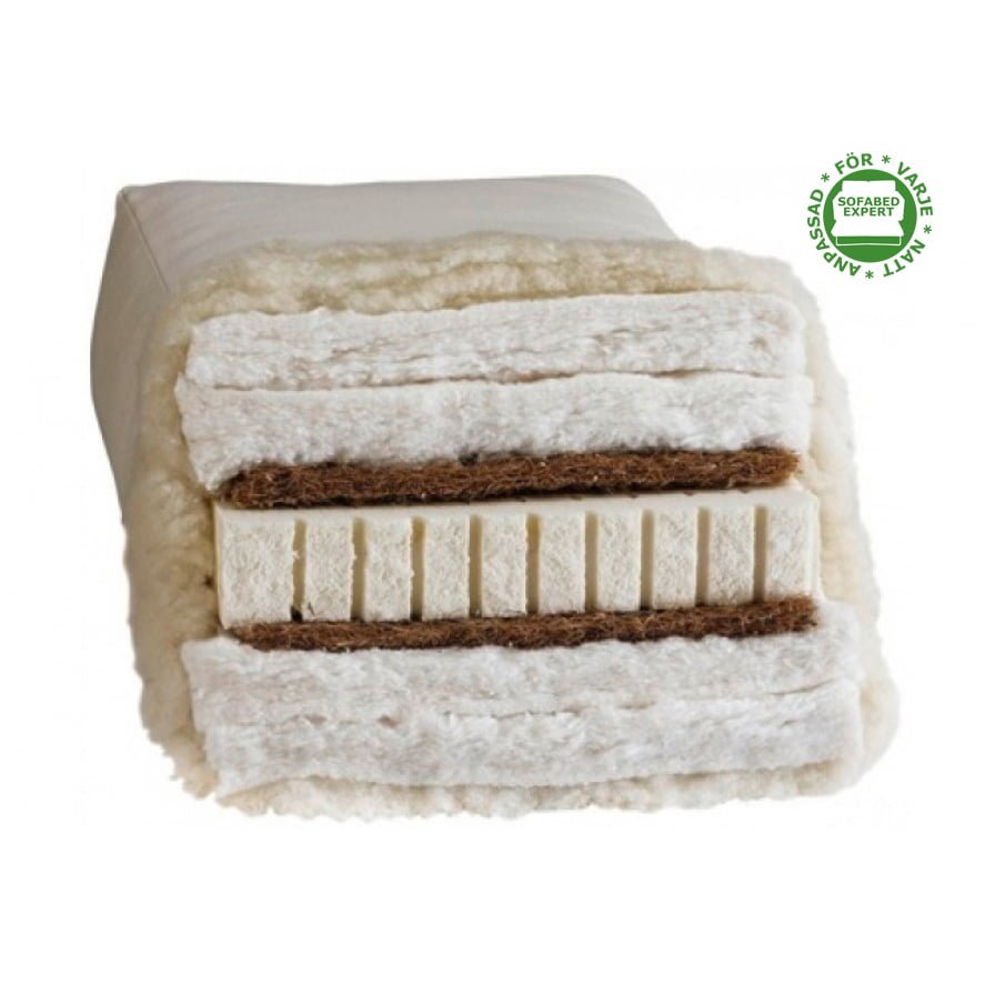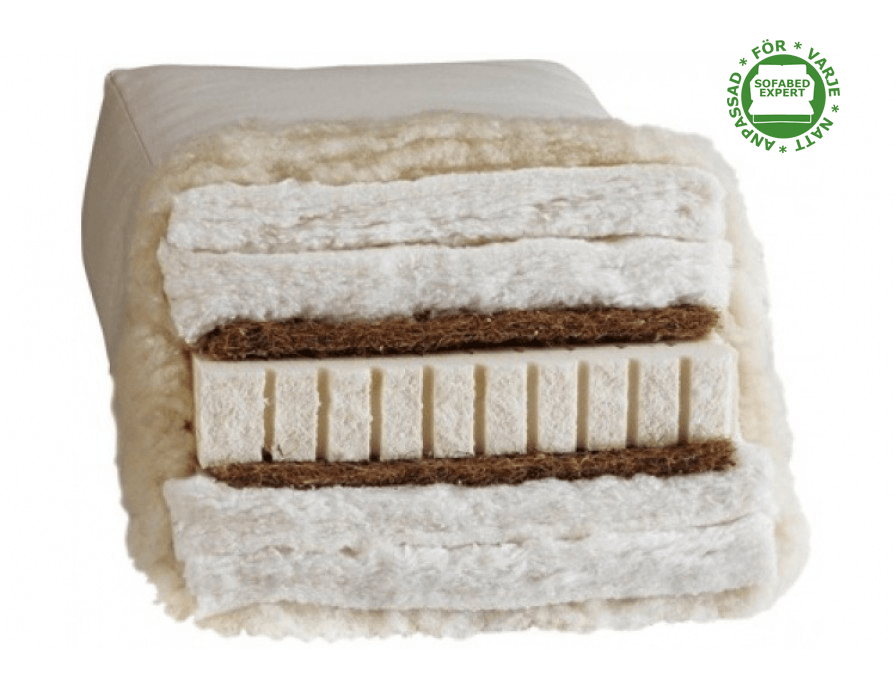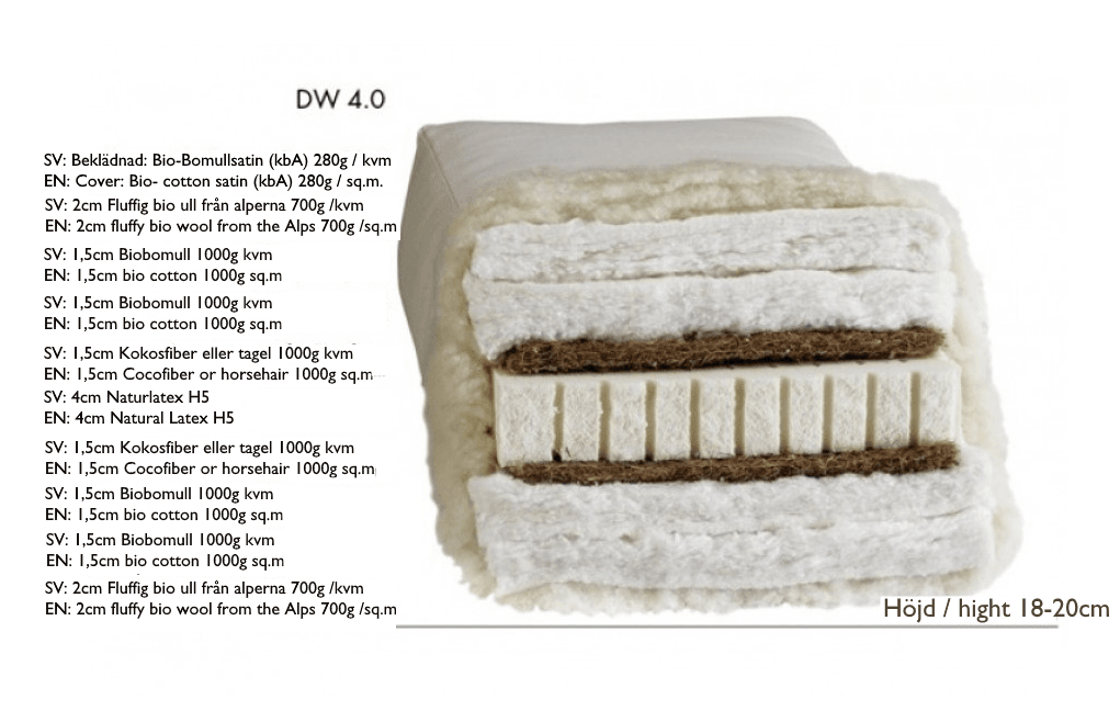 2 x 5 cm naturgummi gör stor elasticitet och 1000 g / kvm vår speciella fleece ull på ytan skapar en mild tryckavlastning för huden, medan 4000 g / kvm bomull (organiskt), och 2000 g / kvm kokosfibrer gör det möjligt för typiska futon fasthet och största andningsförmåga (diffusion), vilket möjliggör det perfekta sängklimatet.