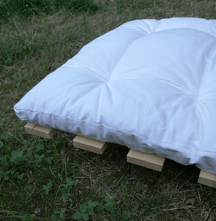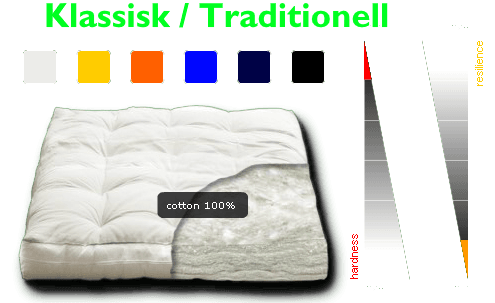 Madrassen tillverkas med en stoppning av 100% naturlig bomull och tyget är i 100% bomull och kan fås i flera olika färger.
