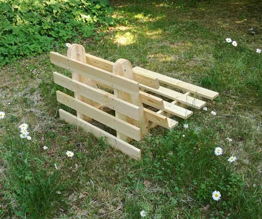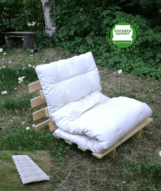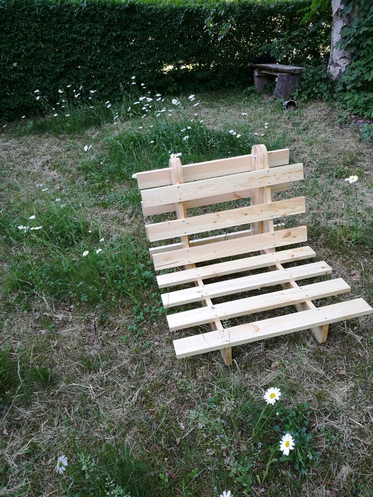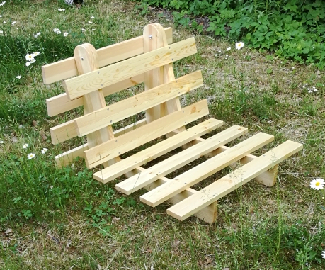 Denna soffa är tillverkad av en liten fabrik i det natursköna nordöstra Polen. En rustik träram med hela 3cm tjocka fururibbor som madrassen ligger på.