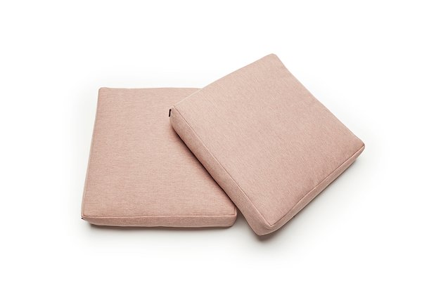 På första bilden visas kuddarna i tyg Soft Coral 557