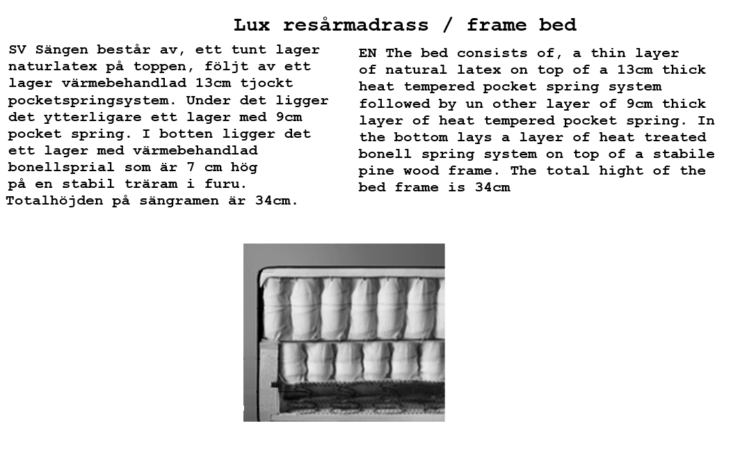 Sängskåpet fås i två standarder standard eller Delux. Delux är ett tjockare skåp där du kan lägga i tjockare madrass. Har ni speciella önskemål så kan vi ordna det mesta.