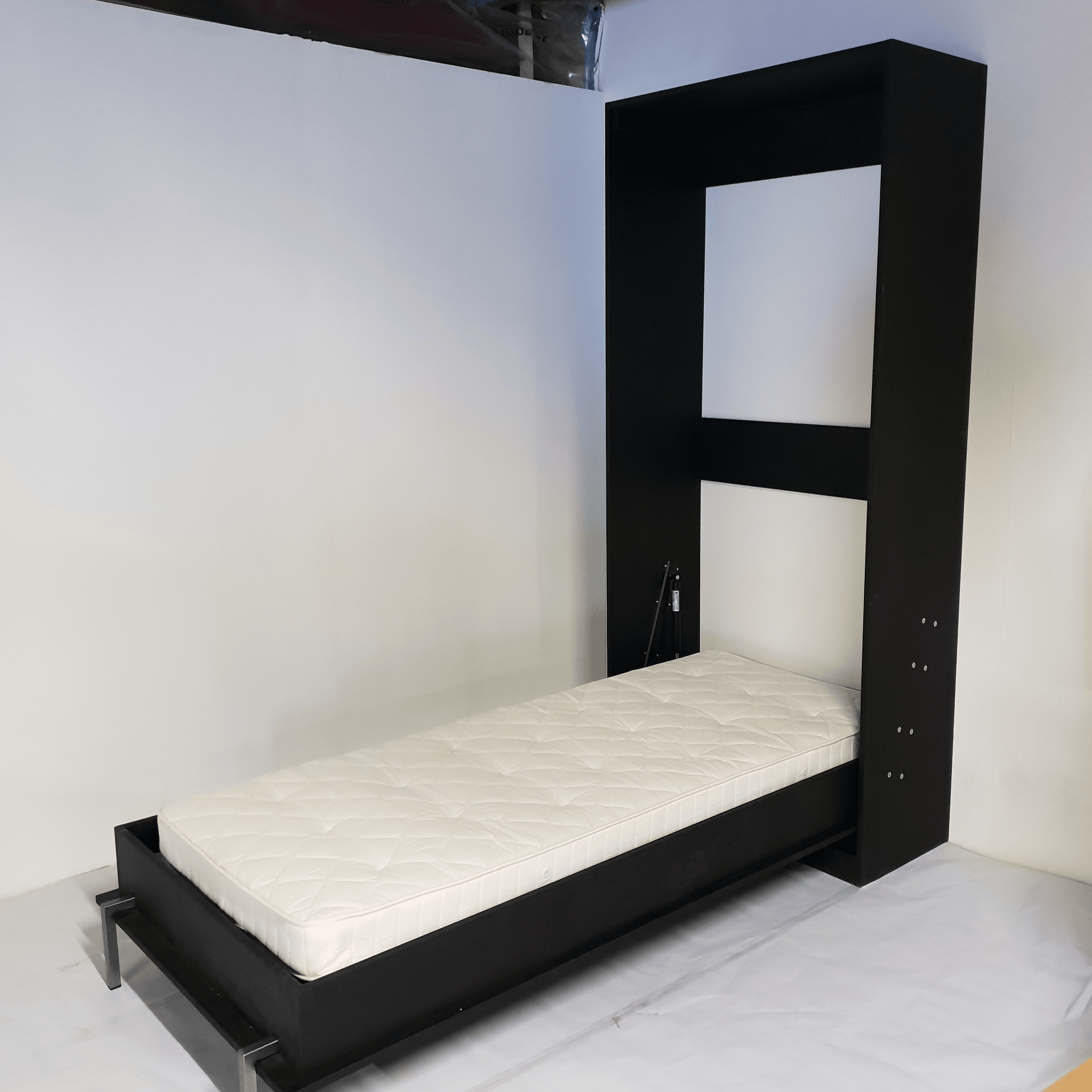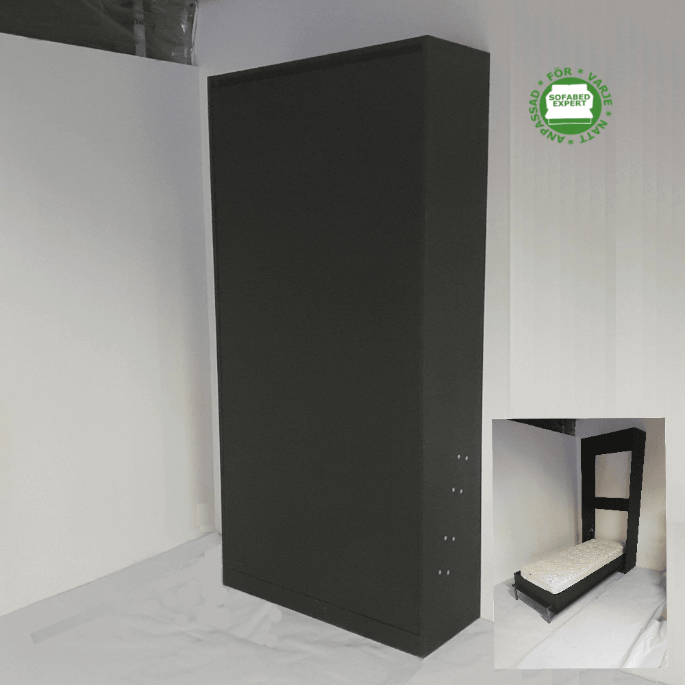 Sängskåpet tillverkas med gasdämpare så att dom är mycket lätta och smidiga att fälla upp och ner. Gasdämparna gör att skåpet försiktigt och nästan ljudlöst. Gasdämparna har fem års fabriksgaranti. Skåpet levereras med en stabil ram för sängen i sockerbitsskarvad furu som på bilden. Benen på skåpet är i rostfritt stål så att det tåler många kilo belastning.