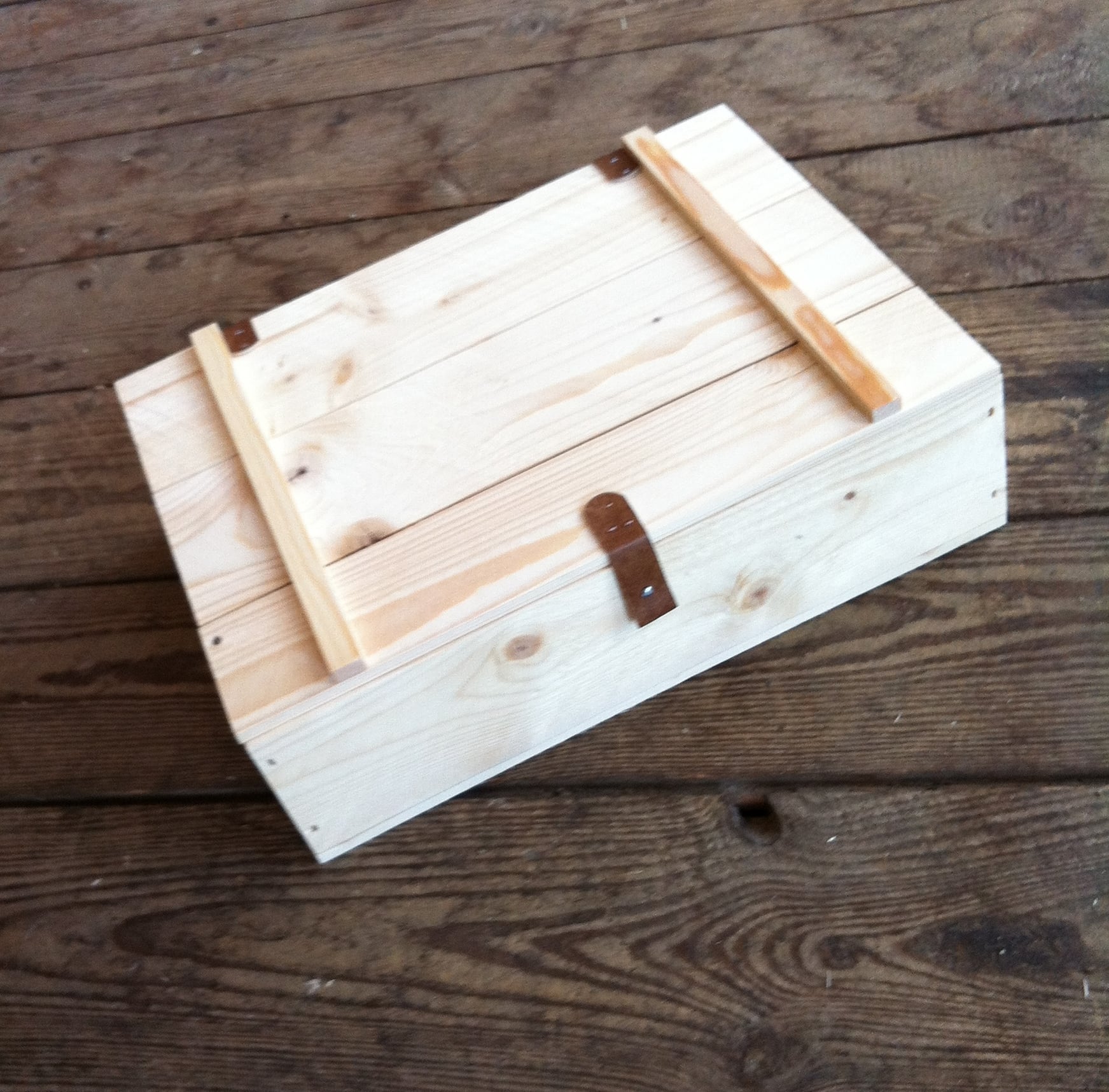 Liten enkel trälåda med ett spänne och hängslen i läderliknande band. Tillverkad i Europa.